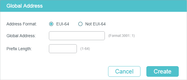 Select the global address format according to your needs. EUI-64: Indicates that you only need to specify an address prefix, then the system will create a global address automatically. Not EUI-64: Indicates that you have to specify an intact global address. |