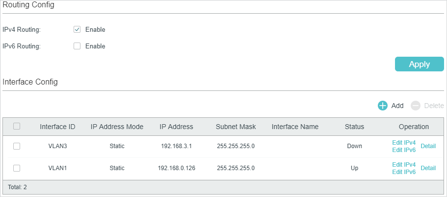 1)In the Routing Config section, enable IPv4 routing or IPv6 routing. Then click Apply.