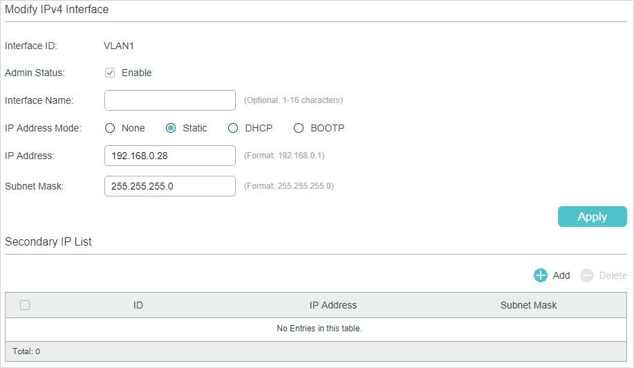 1)In the Modify IPv4 Interface section, configure relevant parameters for the interface according to your actual needs. Then click Apply.